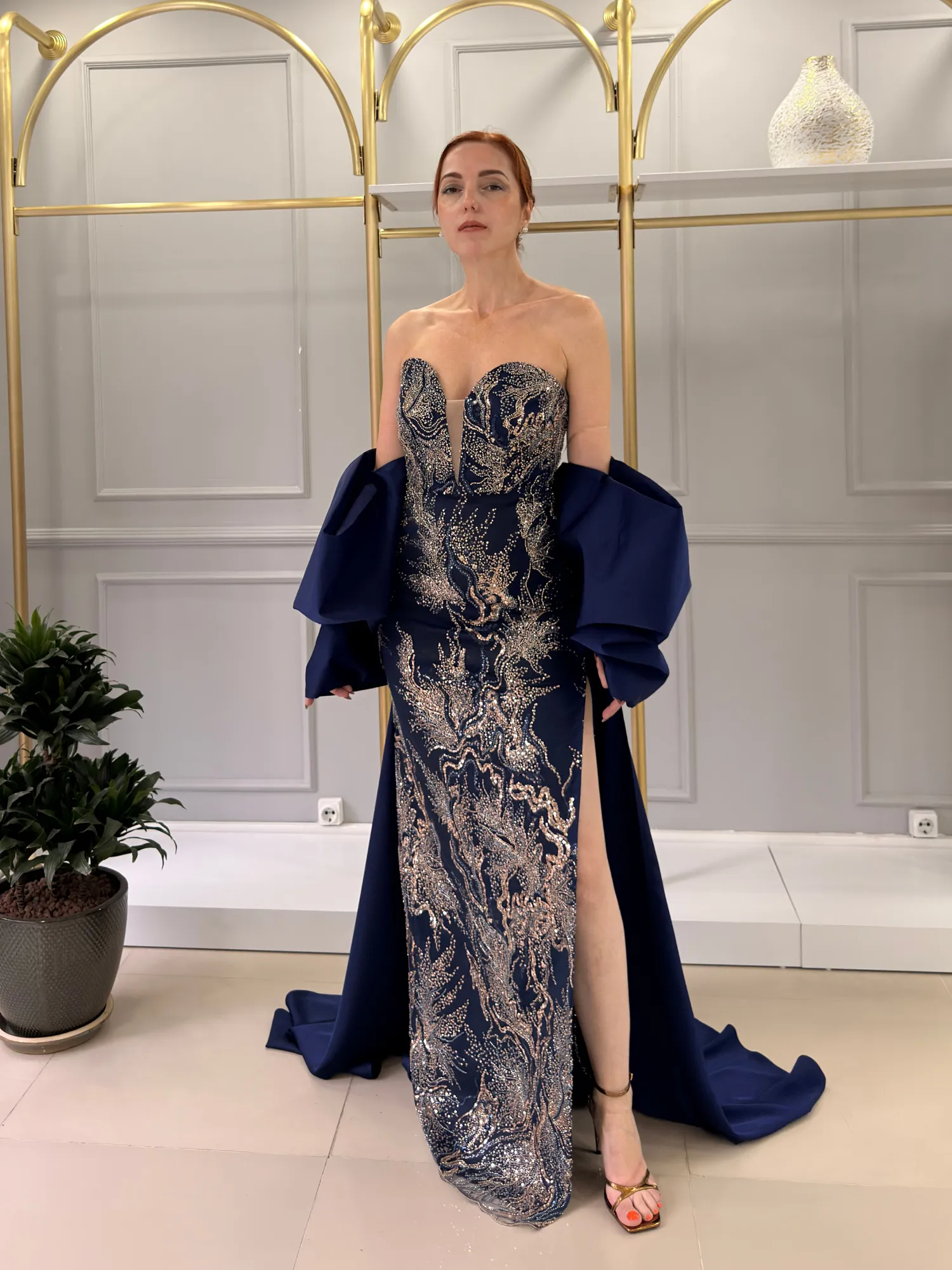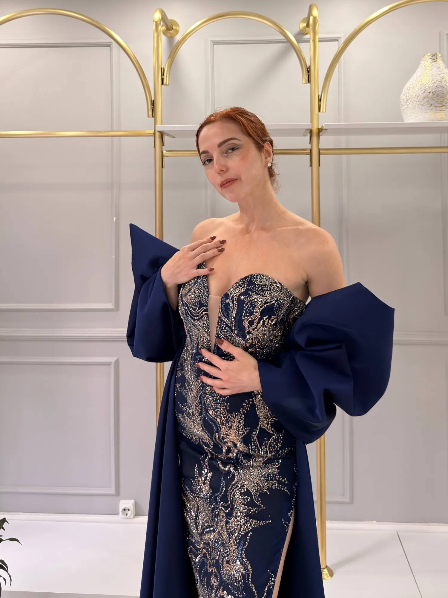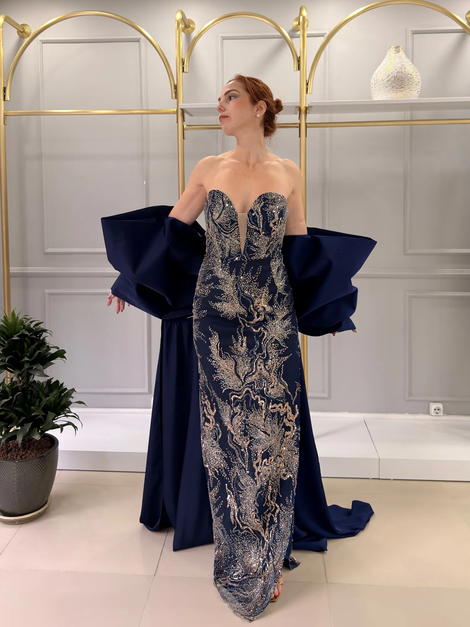 Blue Night, lacivertin asil tonunu gold ışıltıların büyüsüyle buluşturan özel bir Couture tasarımdır. İthal krep saten üzerinde özenle işlenen gold kristaller ve payetler, elbiseye her ışıkta farklı bir derinlik kazandırır. Vücudu saran formu, zarif silüeti öne çıkarırken, derin yırtmacı tasarıma cesur ve dengeli bir şıklık katar. Elbisenin en karakteristik detayı olan fiyonklu pelerin, her adımda havalanarak tasarımı unutulmaz kılar. Etek ucundaki dilim dantel detayı couture ruhunu ince bir dokunuşla tamamlar. Modern, güçlü ve feminen çizgilerin buluştuğu bu tasarım, kırmızı halı, özel davetler, gala akşamları, yeni yıl partileri gibi unutulmaz geceler için tasarlandı. Blue Night, adımlarını sıradan bir yürüyüşten kırmızı halı etkisine dönüştüren özel bir Couture tasarımdır. Yeni bir yıla kırmızı halı etkisi yaratarak girmek isteyen Anhelo kadınları, yeni Blue Night ile tanışın...