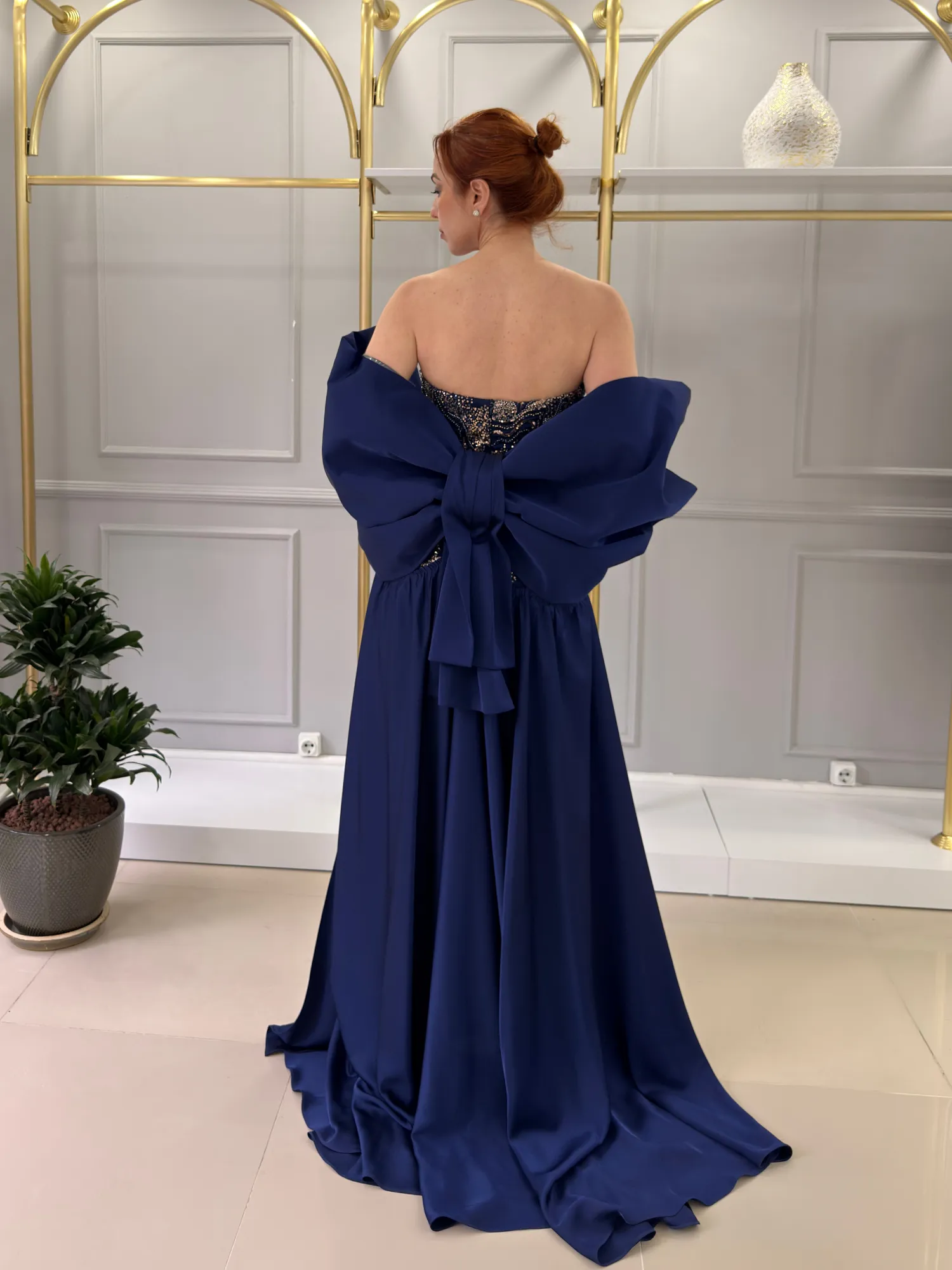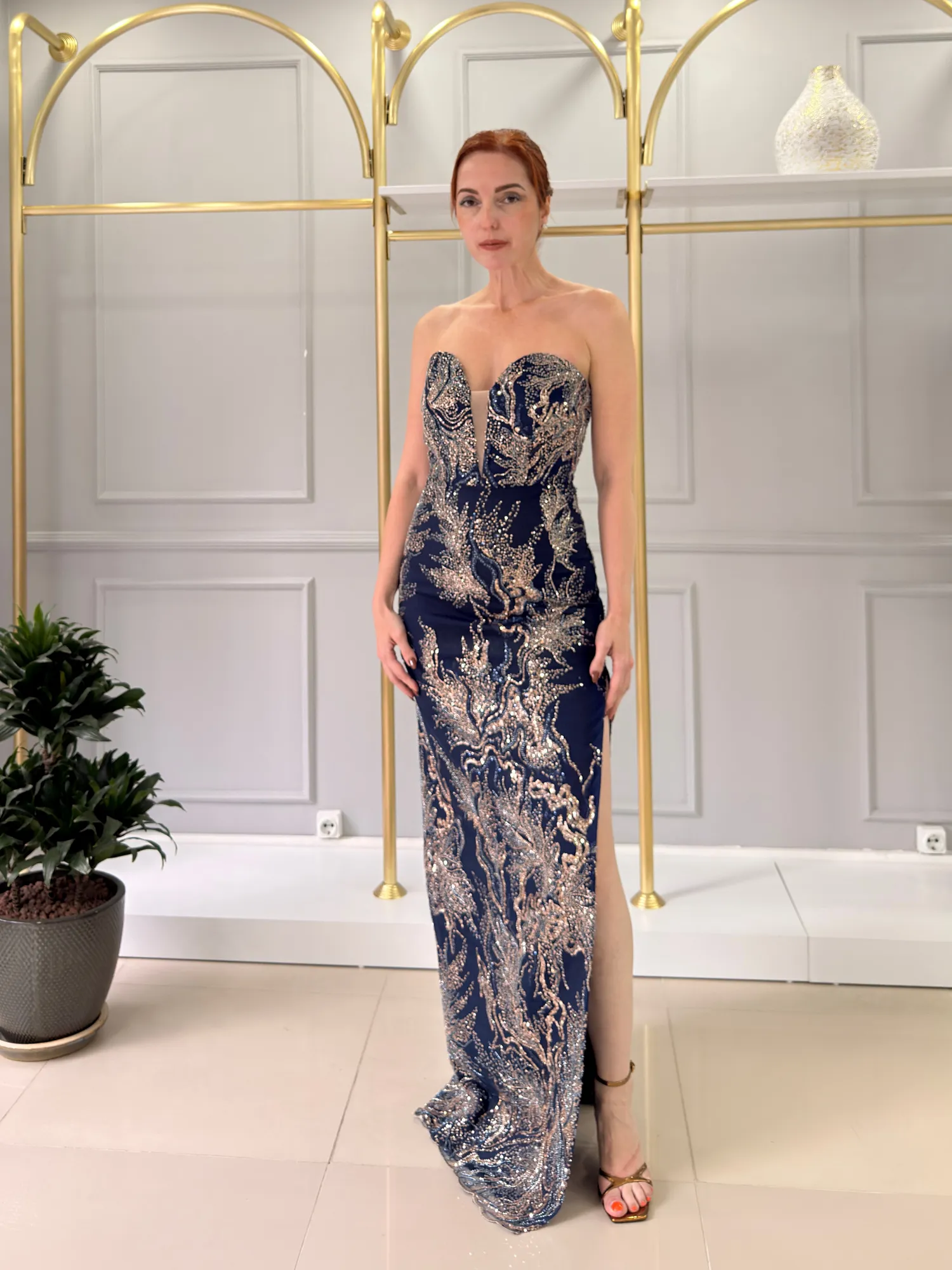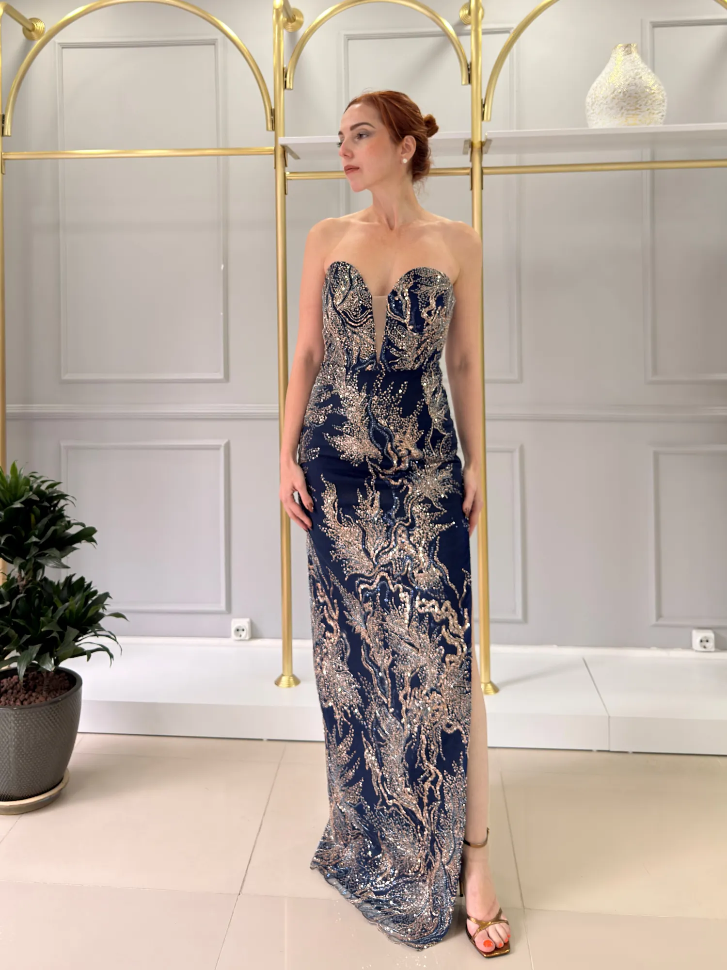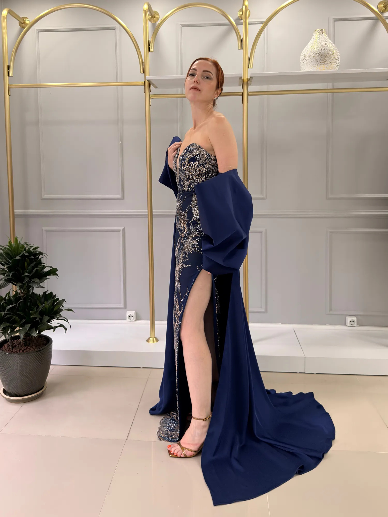 Blue Night, lacivertin asil tonunu gold ışıltıların büyüsüyle buluşturan özel bir Couture tasarımdır. İthal krep saten üzerinde özenle işlenen gold kristaller ve payetler, elbiseye her ışıkta farklı bir derinlik kazandırır. Vücudu saran formu, zarif silüeti öne çıkarırken, derin yırtmacı tasarıma cesur ve dengeli bir şıklık katar. Elbisenin en karakteristik detayı olan fiyonklu pelerin, her adımda havalanarak tasarımı unutulmaz kılar. Etek ucundaki dilim dantel detayı couture ruhunu ince bir dokunuşla tamamlar. Modern, güçlü ve feminen çizgilerin buluştuğu bu tasarım, kırmızı halı, özel davetler, gala akşamları, yeni yıl partileri gibi unutulmaz geceler için tasarlandı. Blue Night, adımlarını sıradan bir yürüyüşten kırmızı halı etkisine dönüştüren özel bir Couture tasarımdır. Yeni bir yıla kırmızı halı etkisi yaratarak girmek isteyen Anhelo kadınları, yeni Blue Night ile tanışın...