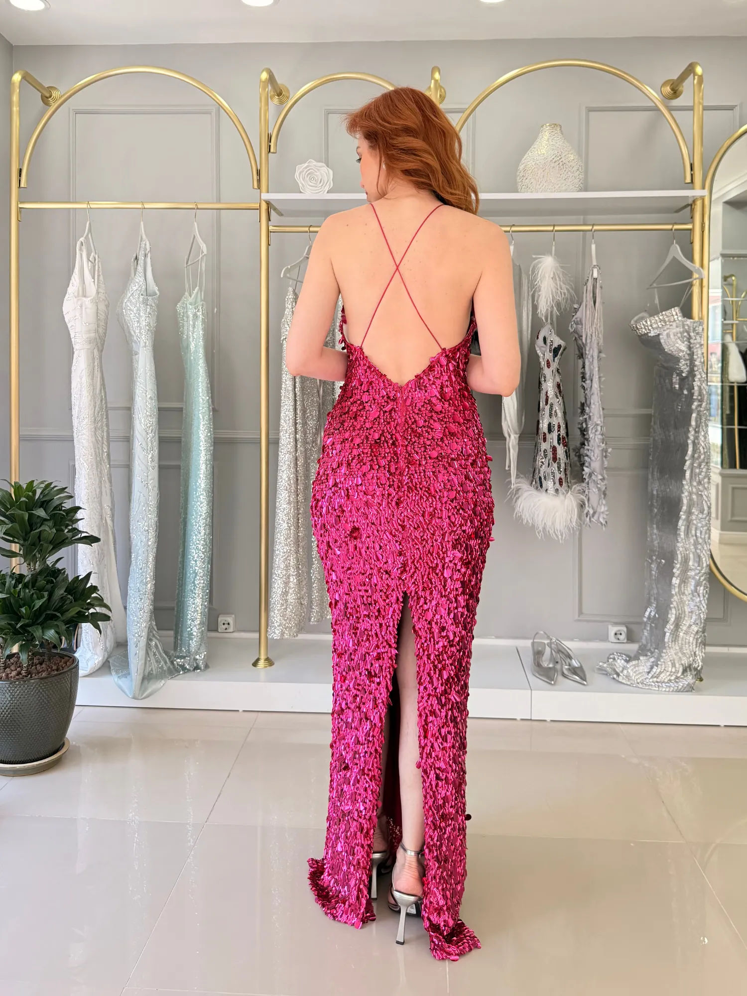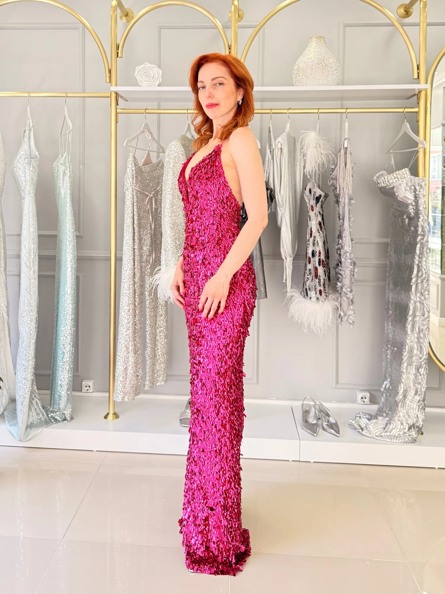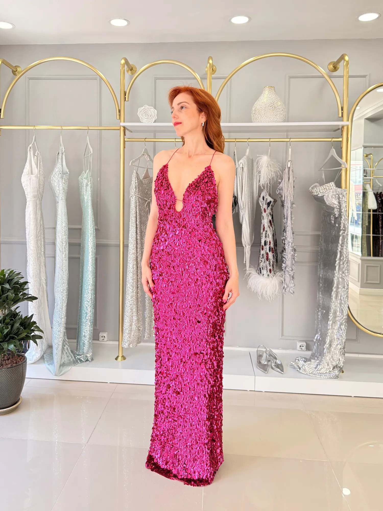 Kumaş: Fuşya Payetli İthal Kumaş & Yumuşak Dokulu Astar & İthal Aksesuar