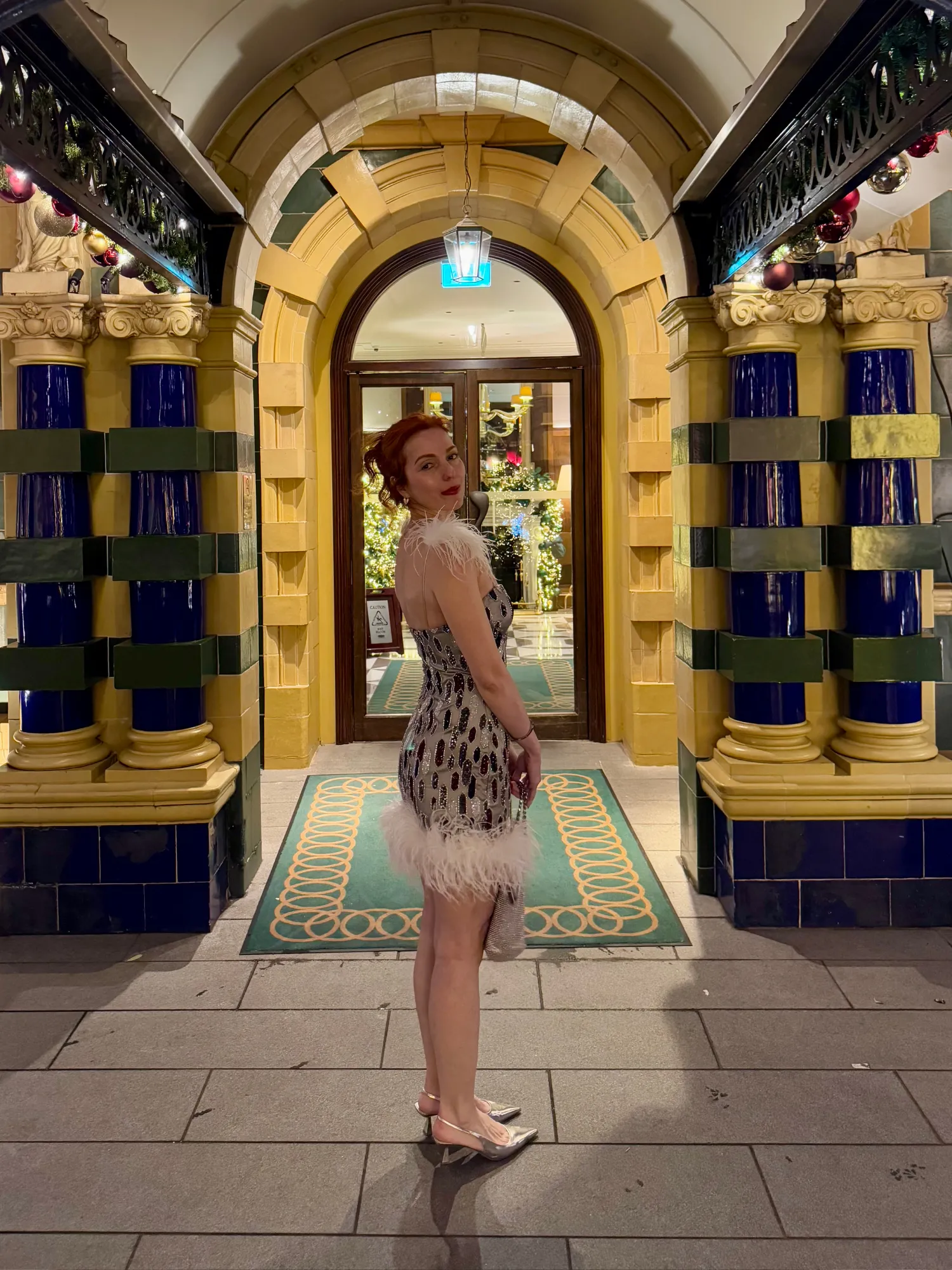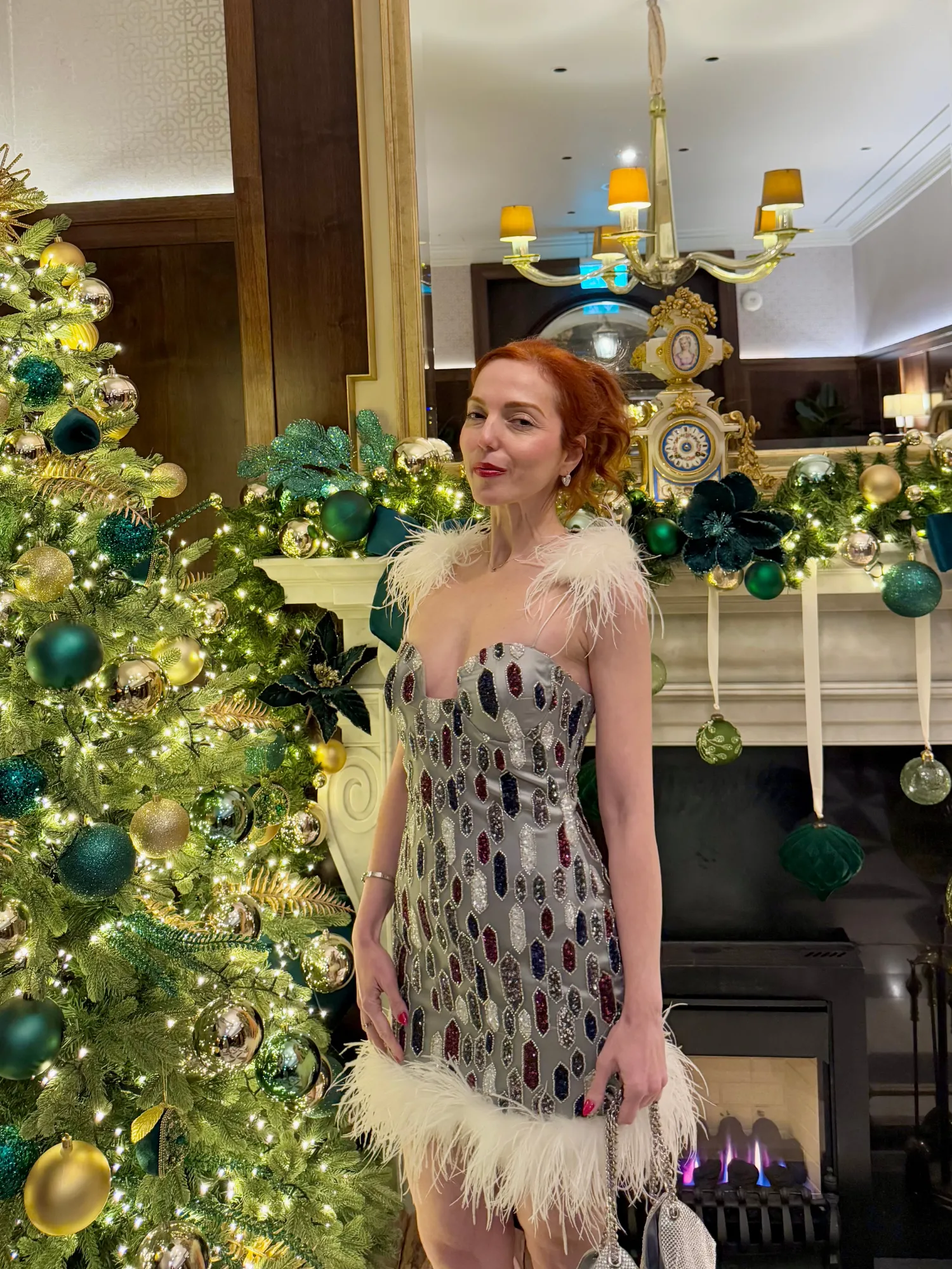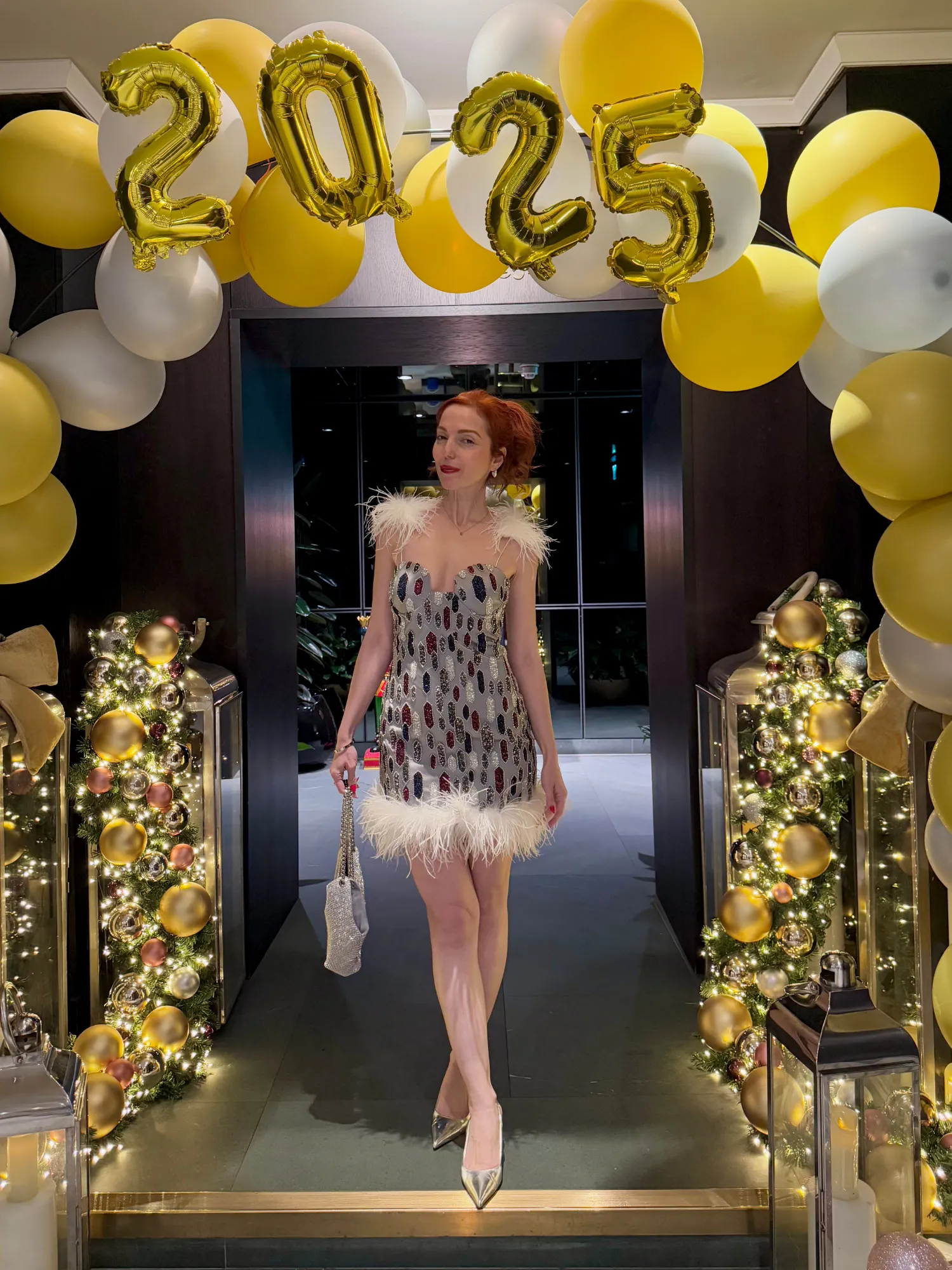 Geometrik Desen İşlemeli Tüy Detaylı Saten Astarlı Mini Elbise.