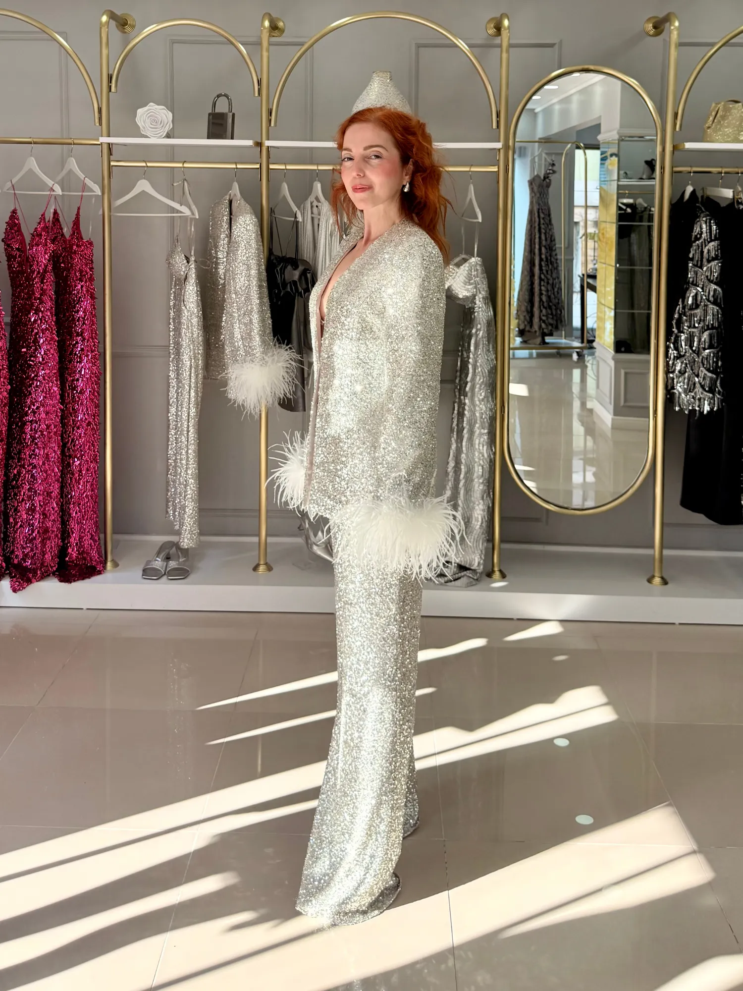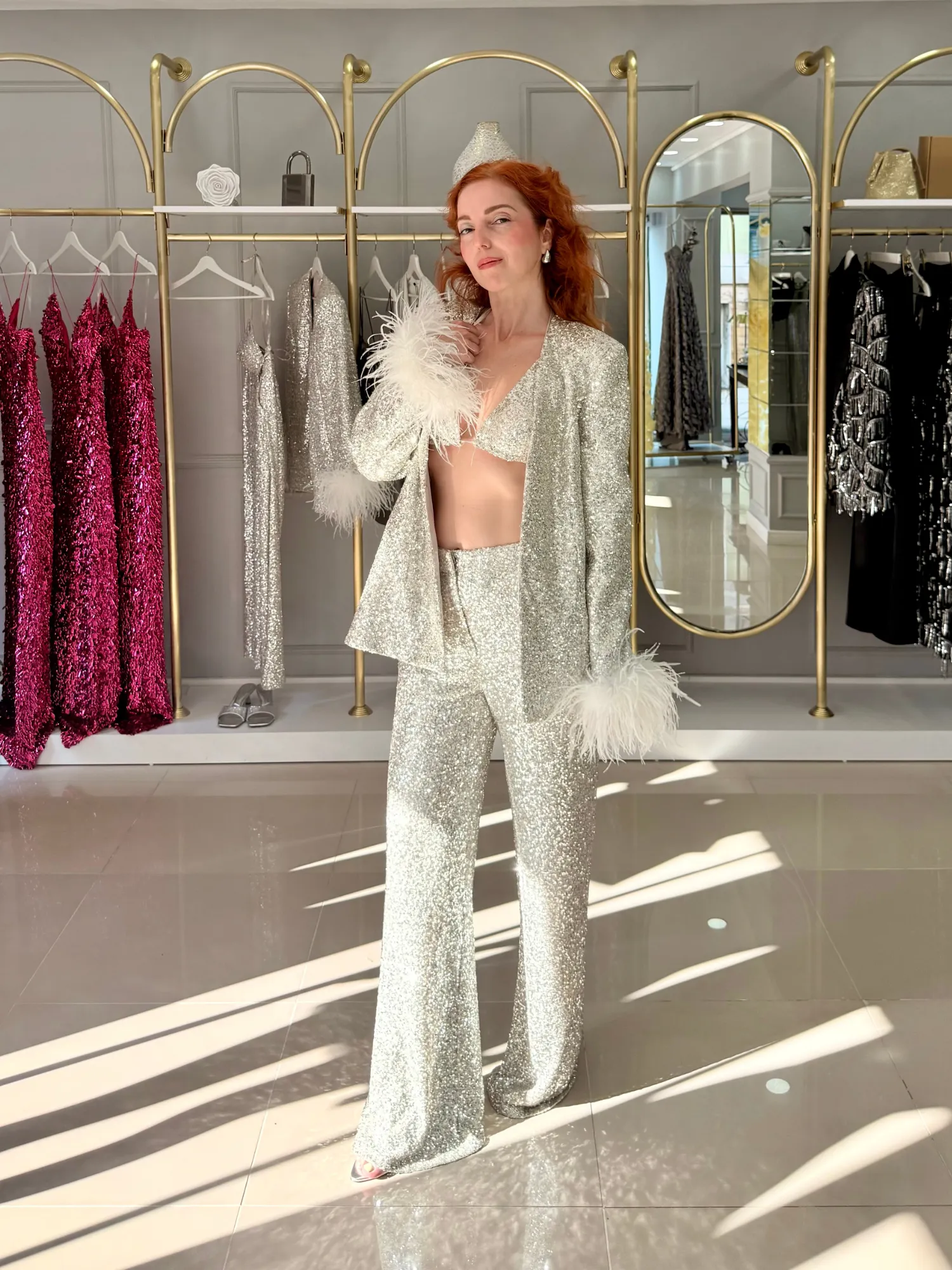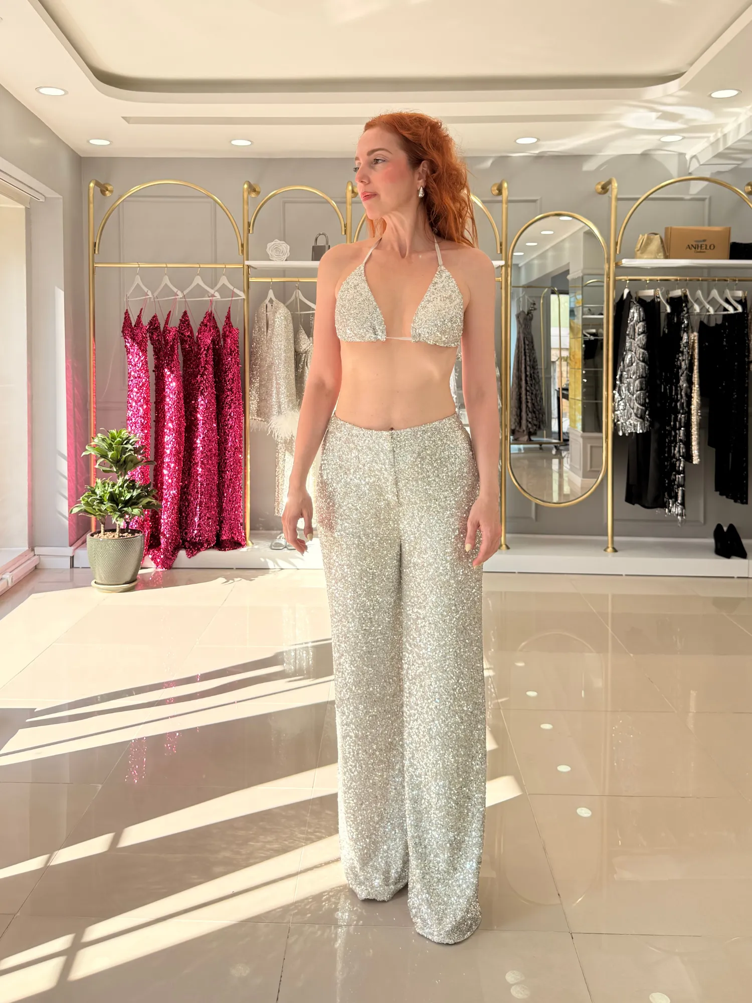 Payet, saten ve tüy...Gümüş ışıltının bedenle buluştuğu cesur bir silüet Brillante Set...