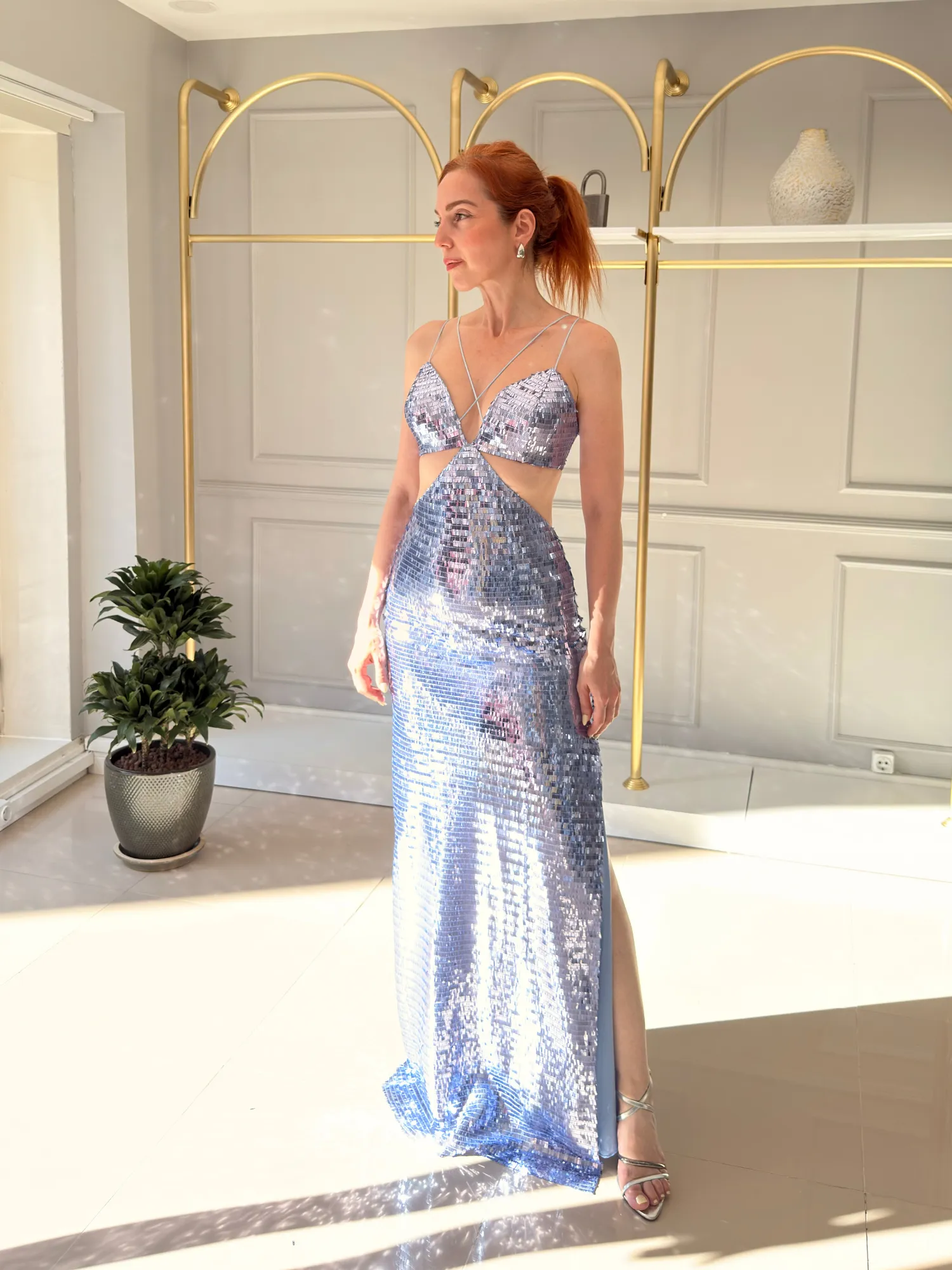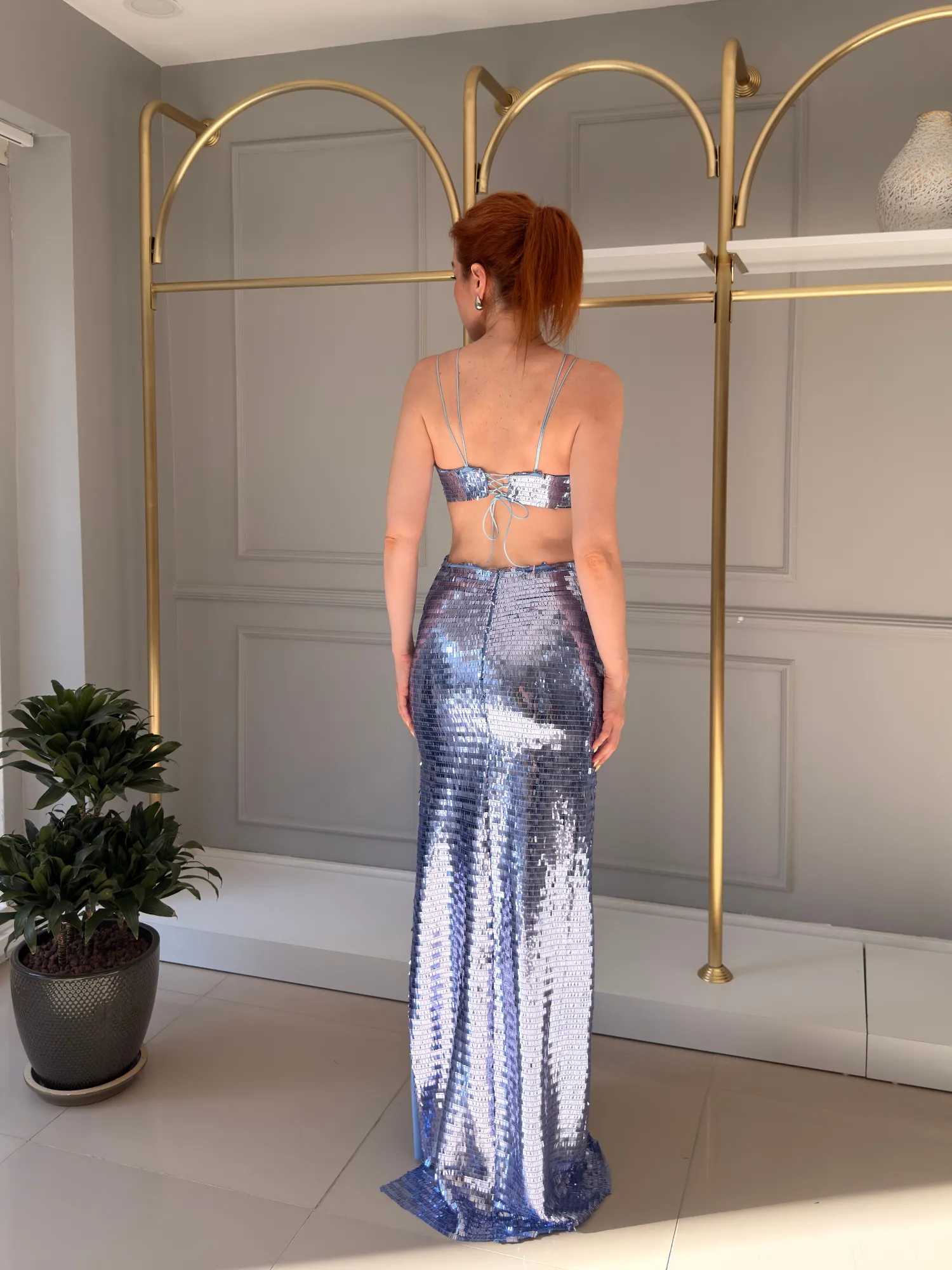 Mavi ve morun büyüleyici uyumu ile tasarlanan Mermaid, okyanusun kalbinden çıkan bir denizkızı gibi hissettiriyor. İnce ip askılı yapısı, bel ve sırt dekoltesi ile zarafeti cesaretle buluşturan bu tasarım feminenliğin en iddialı halini yansıtıyor. Sol yandaki derin yırtmaç, her adımda özgürlük hissi sunarken elbisenin tamamına işlenmiş payetler ışığı her açıdan yansıtarak sizi gecenin yıldızı haline getiriyor. Mermaid, yalnızca bir elbise değil bir dönüşüm...Gündüzden geceye tek elbise ile stilini yarat. Düğün, nişan, doğumgünü kutlamaları, after party'ler, lüks akşam yemekleri, rooftop davetleri, gala geceleri için tasarlandı.