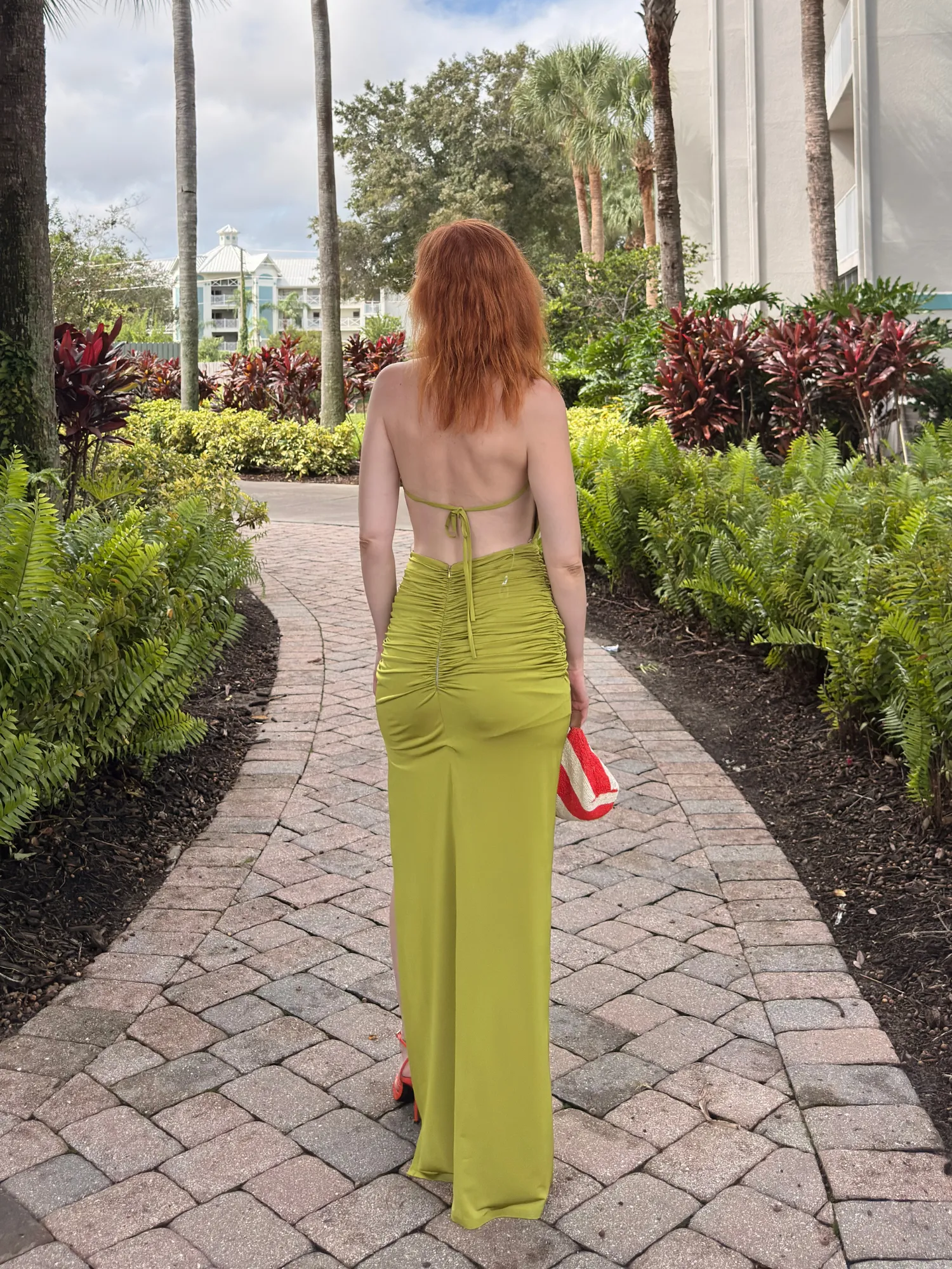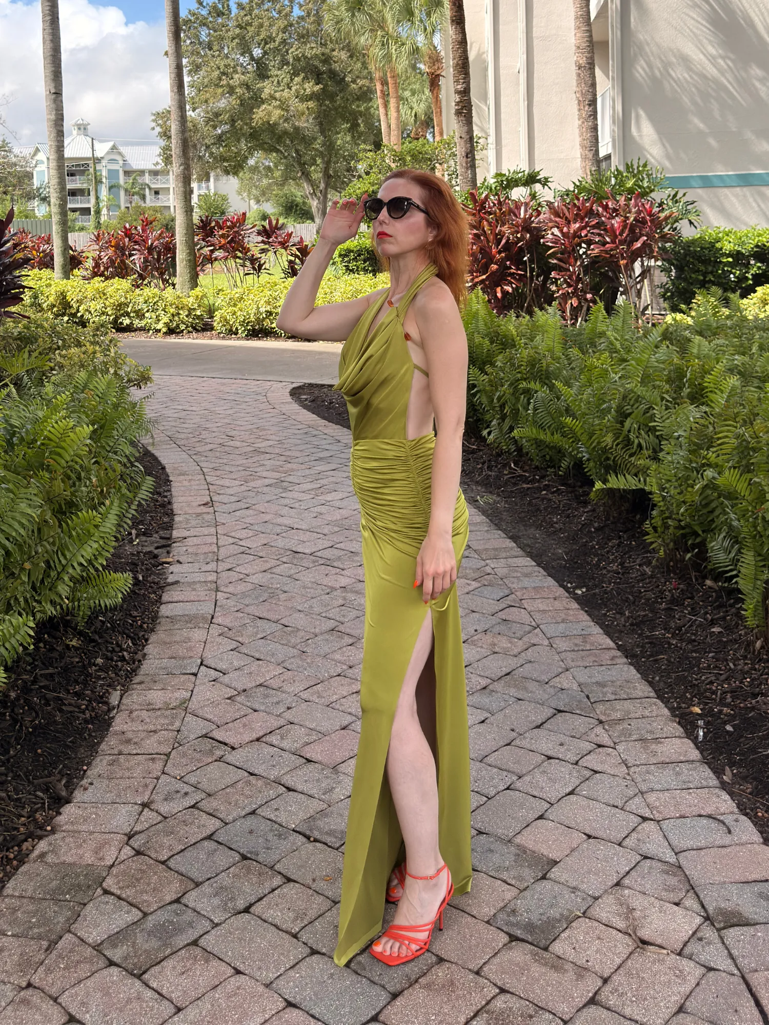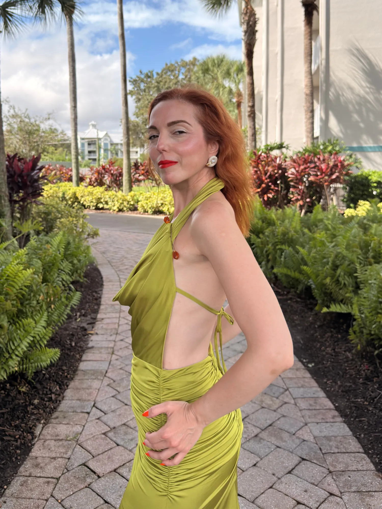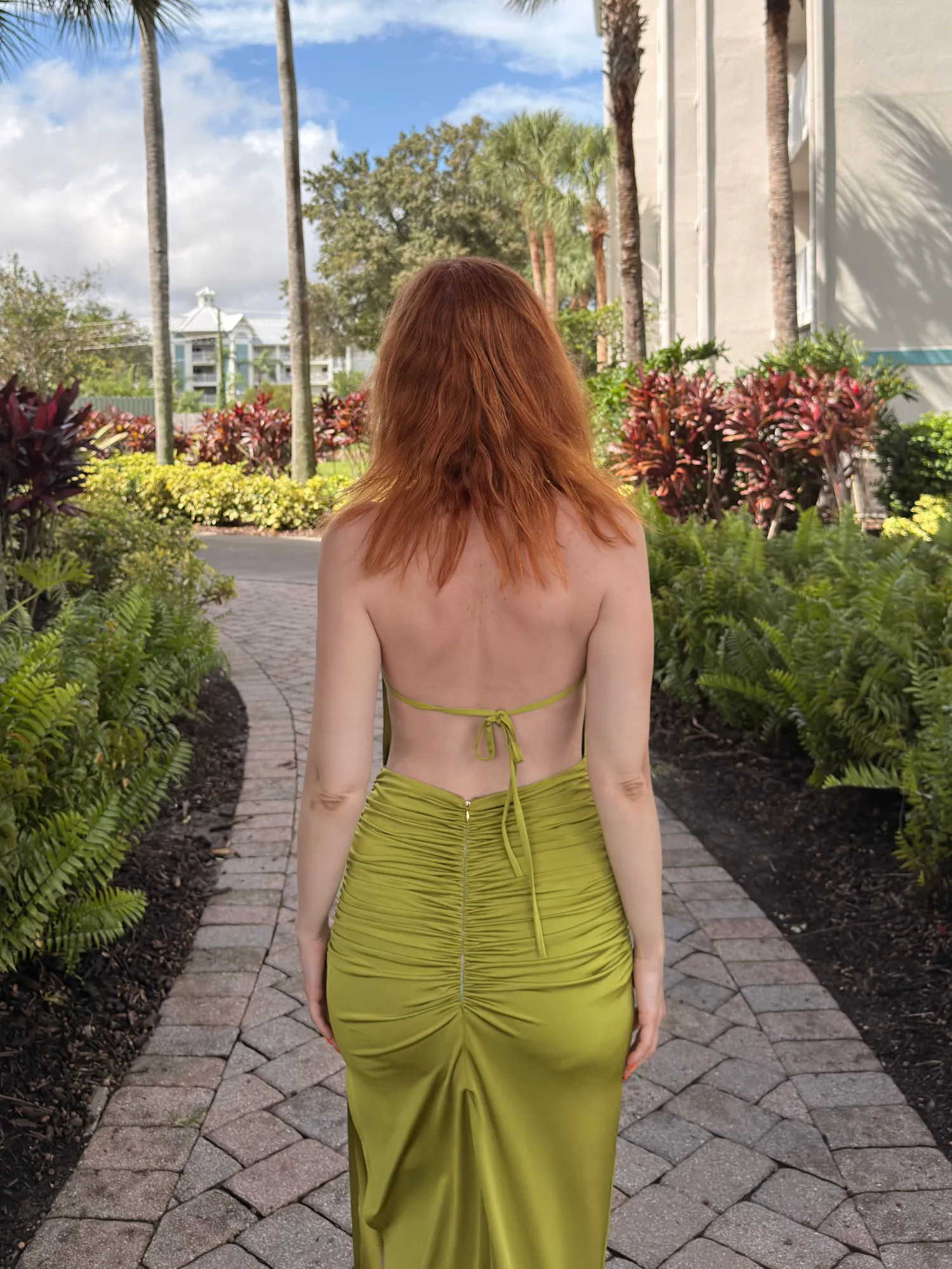 Doğadan ilham alan ama şehirler ışıkları kadar iddialı Palm Dress, özgüveniyle ışıldayan kadınlar için tasarlandı. Likralı kumaşıyla vücudu kusursuzca sararken, degaje yakası zarafeti incelikle yansıtır. Cesur sırt dekoltesiyle büyüleyici bir özgürlük hissi yaratır. Ön ve arka etekteki büzgü detayları ise feminen silüeti kusursuzca ortaya çıkarır. Sol yandaki zarif yırtmaç, her adımda zarafetinle birlikte gücünü sahneye taşır. Yeşilin palmiyelerden aldığı enerjiyi taşıyan bu tasarım, doğal tonların içinde bile göz kamaştıran bir ışıltı sunar. Palm Dress doğanın huzuruyla kadın enerjisinin gücünü buluşturan bir tasarım manifestosudur. Kendine güven, doğayla bütünleş, ışığınla parılda...Çünkü gerçek zarafet, özgüvenden doğar.