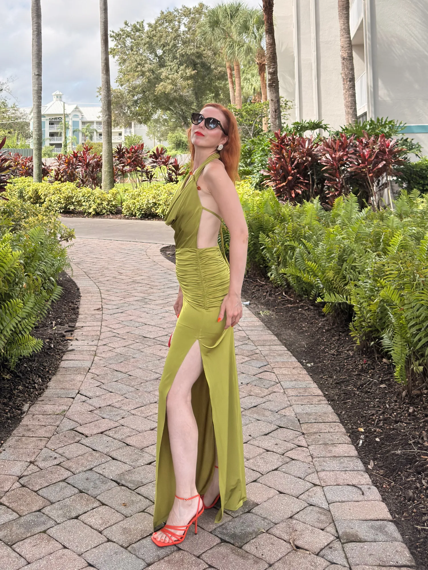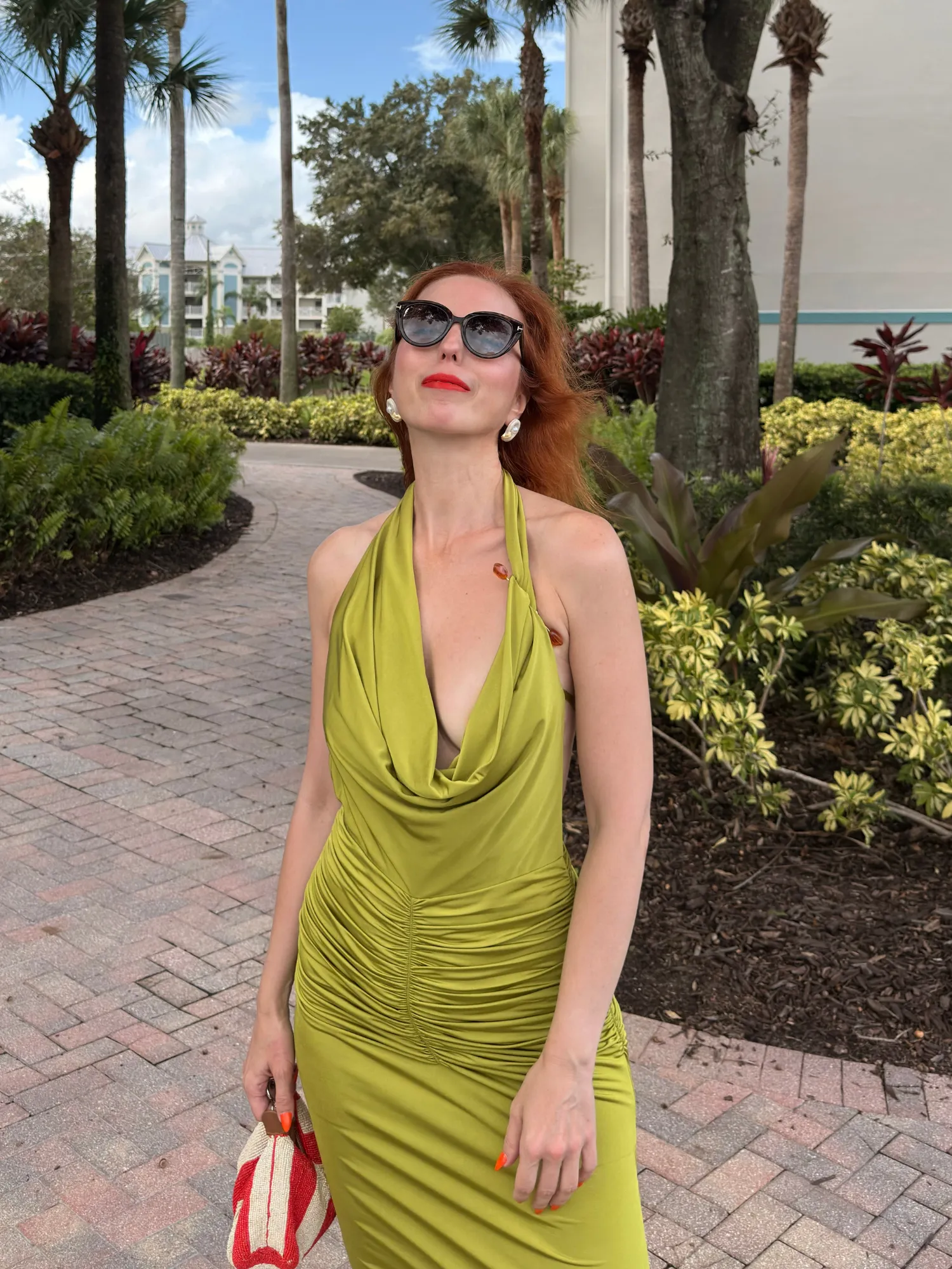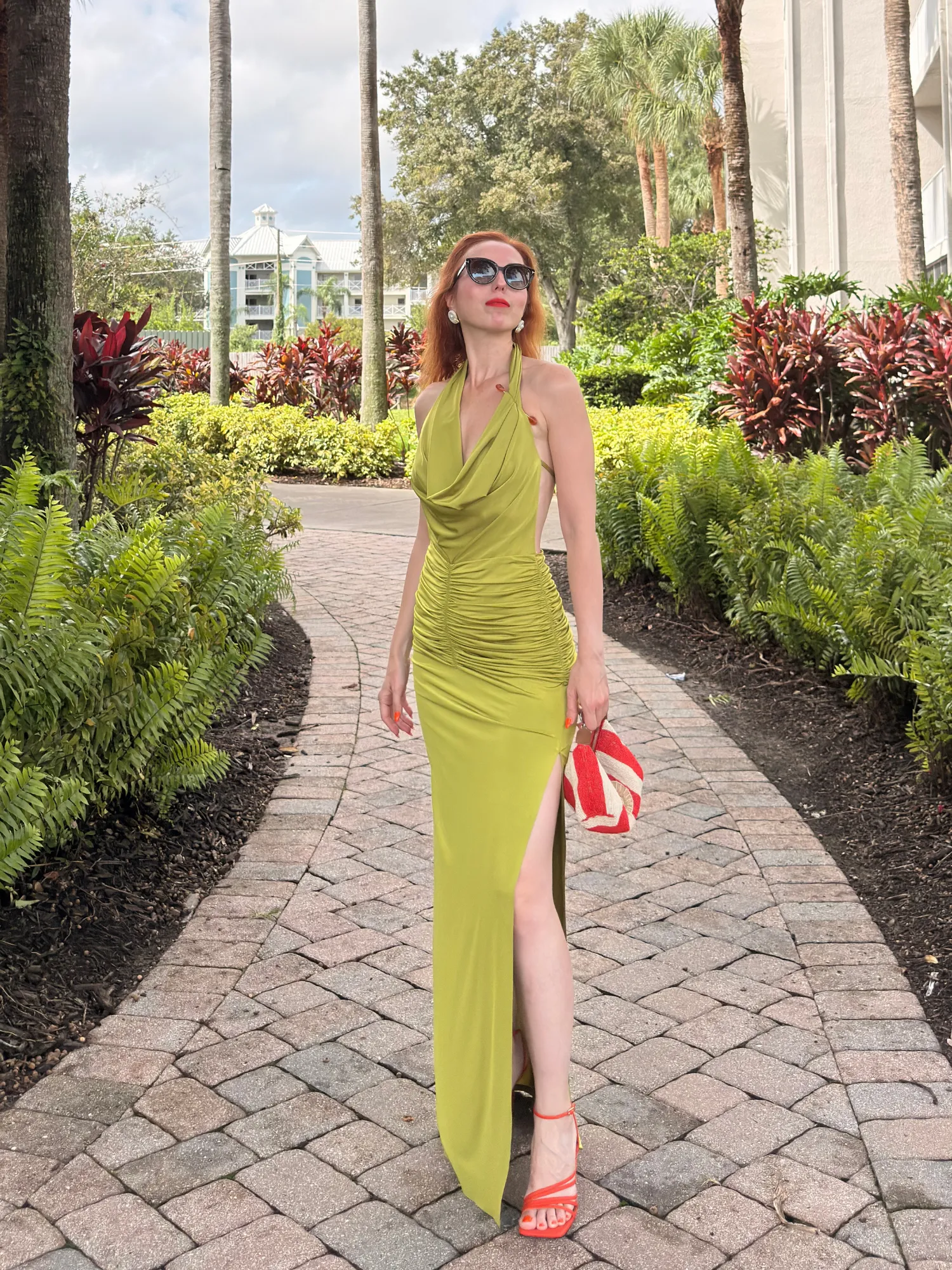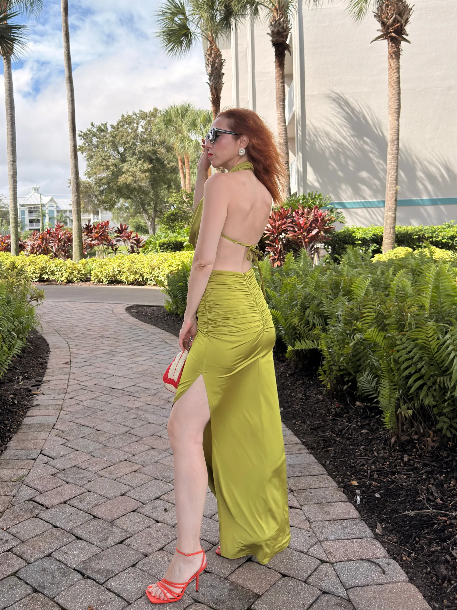 İnce bantlı altın ya da bronz tonlarında topuklu sandaletler, saten, metalik dokulu veya bej çantalar ile bütünlük sağlayabilirsiniz. Yeşil taşlı bir yüzük veya kabuk detaylı bileklik ve küpe ile doğal bir kombin elde edebilirsiniz. Hafif dalgalı açık saç ve sade bir makyaj ile doğal bir vibe elde edebilirsiniz.